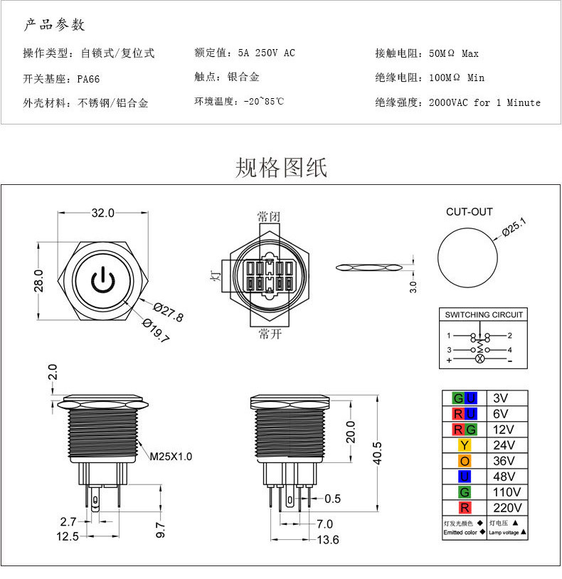 ◆安装孔径25mm,产品属于防水系列金属按钮开关,复位常开功能。安装部防水、防尘等。小的功耗,更全面的电压规格(DC/AC1.8V-220V),全新的不锈钢按钮大大提高了产品的抗冲击性、抗震性和耐腐蚀性。