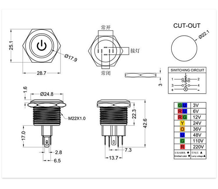 ◆安装孔径22mm,产品属于防水系列金属按钮开关,复位/自锁(常开/常闭)功能。安装部防水、防尘等。小的功耗,更全面的电压规格(DC/AC1.8V-220V),全新的不锈钢按钮大大提高了产品的抗冲击性、抗震性和耐腐蚀性。
