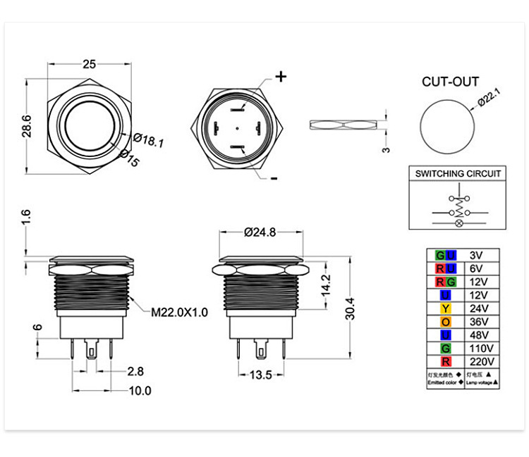 ◆安装孔径22mm,产品属于防水系列金属按钮开关,复位常开功能。安装部防水、防尘等。小的功耗,更全面的电压规格(DC/AC1.8V-220V),全新的不锈钢按钮大大提高了产品的抗冲击性、抗震性和耐腐蚀性。