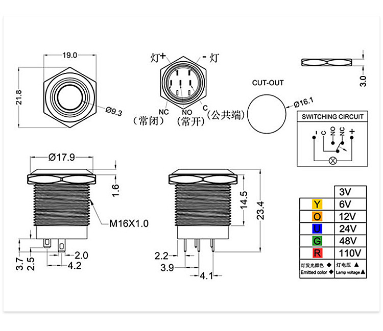 ◆安装孔径16mm,产品属于防水系列金属按钮开关,复位常开功能。安装部防水、防尘等。小的功耗,更全面的电压规格(DC/AC1.8V-220V),全新的不锈钢按钮大大提高了产品的抗冲击性、抗震性和耐腐蚀性。