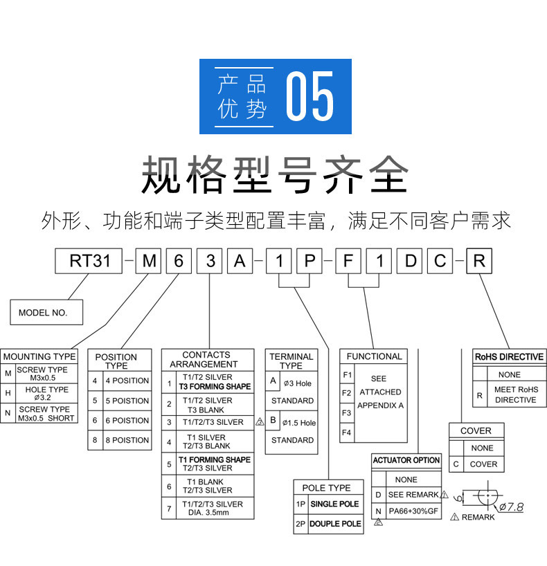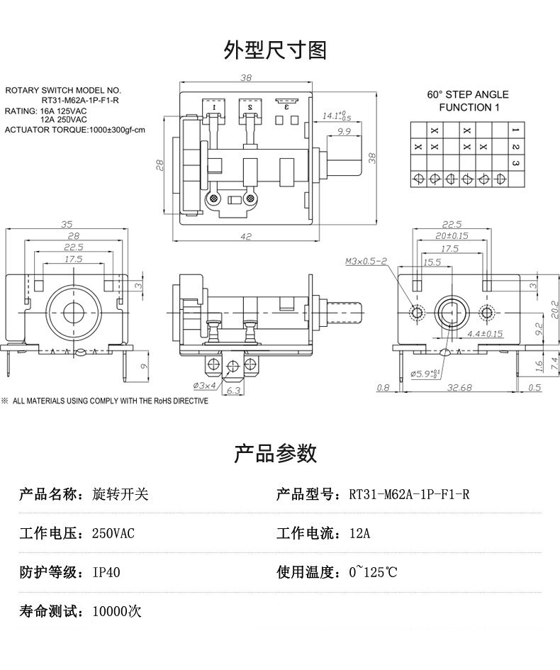 7.综述:旋转开关多用在电暖器、烤箱、电气灶、电烤炉、鼓风机、加湿器,、按摩器材、 电烤箱、 暖风机等家用电器及仪器、机械设备做电源控制机械等大功率电器上。可360度通段旋转,档位之间的角度有90/60/45(可作4档,6档,8档功能)