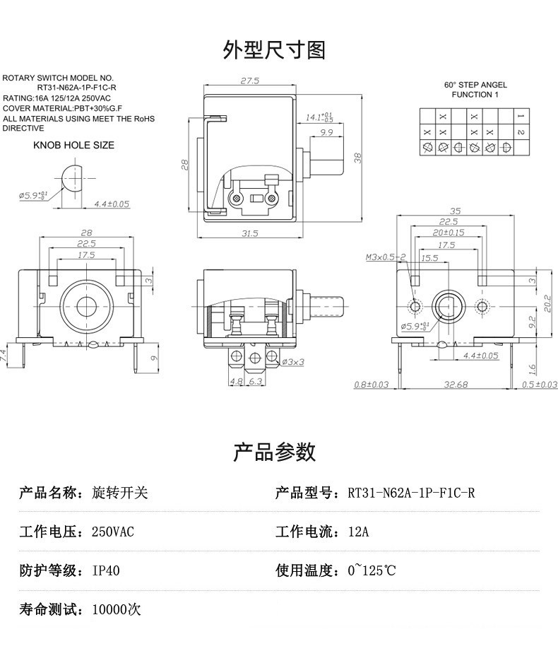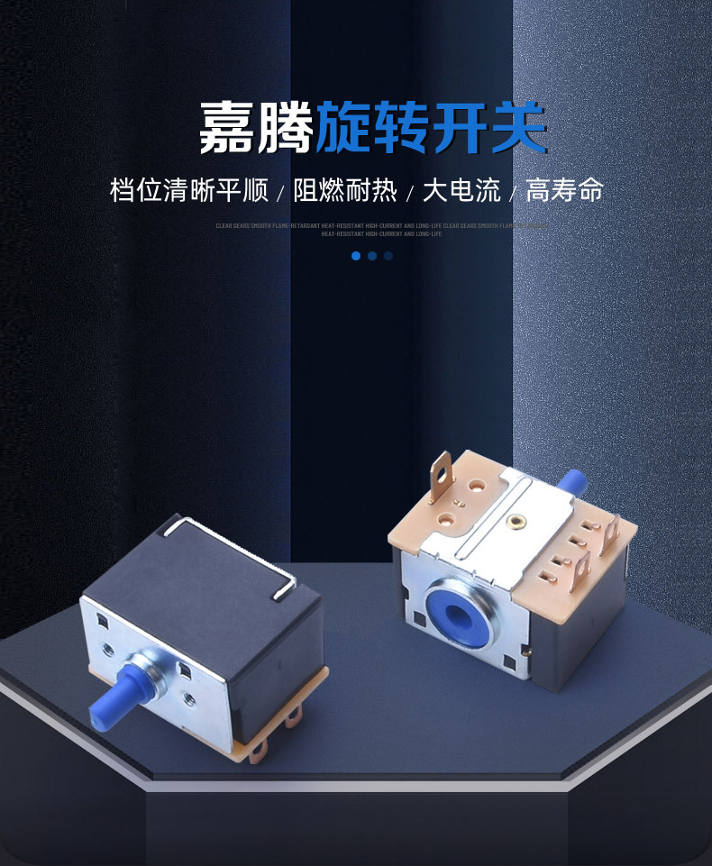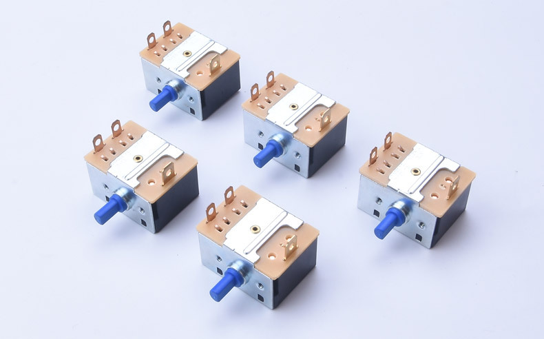 7.综述:旋转开关多用在电暖器、烤箱、电气灶、电烤炉、鼓风机、加湿器,、按摩器材、 电烤箱、 暖风机等家用电器及仪器、机械设备做电源控制机械等大功率电器上。可360度通段旋转,档位之间的角度有90/60/45(可作4档,6档,8档功能)
